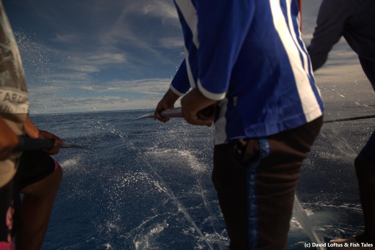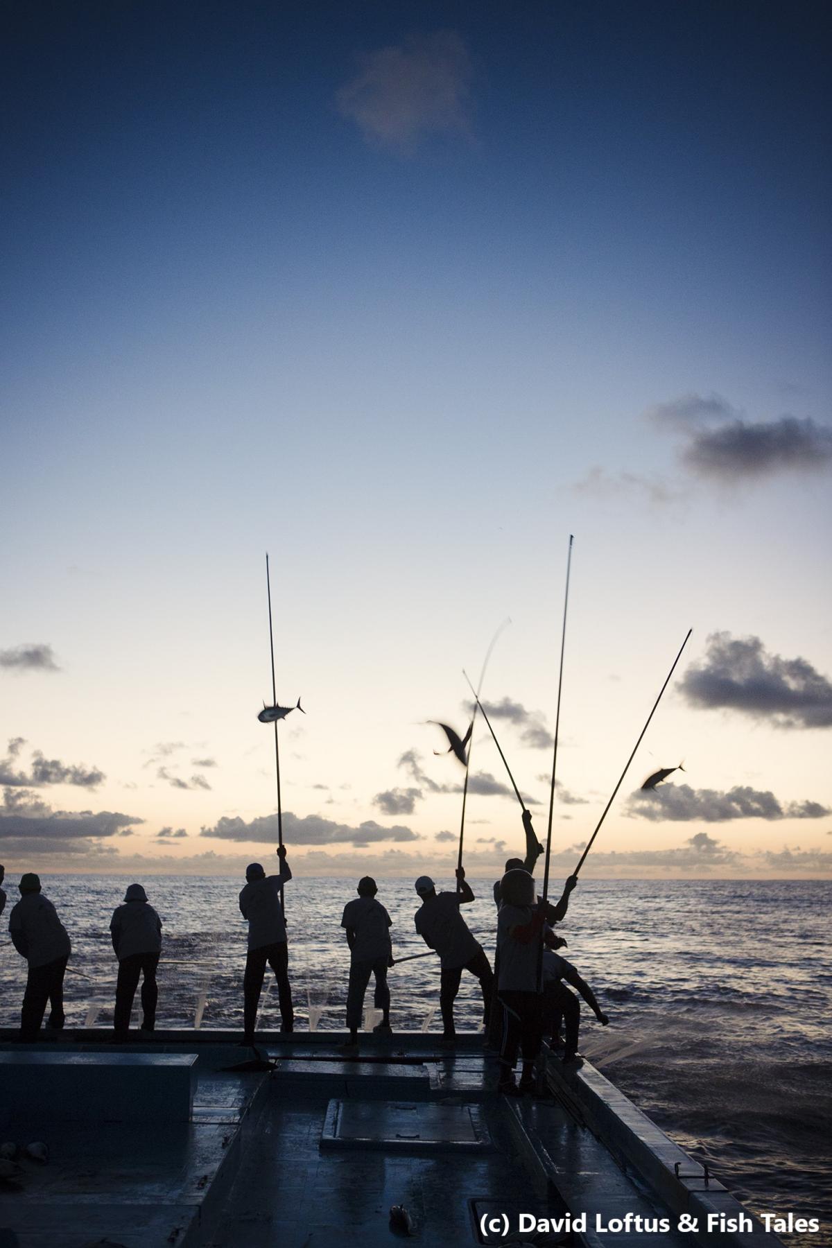 All the tuna from this fishery is caught using traditional pole-and-line methods, using one hook on a line attached to a bamboo pole, catching one fish at a time. Most fishing vessels employ a crew of about 15-20 fishers, and they catch small, live fish to use as bait for the tuna close to shore. Once the live bait is caught, vessels travel out to the open water searching for schools of tuna using binoculars and relying on sightings of birds and/or dolphins. Flocks of birds hovering above the surface of the ocean are good indicators of feeding schools of fish, and fishers have used these sightings to locate tuna for many years. Once located, the fishers use the live bait fish to keep the tuna swimming around the boat in a frenzy, which helps when landing the fish on their hooks. The boats spray water off the back of the vessel onto the surface of the ocean, to mimic the action of fish being chased by predators, which also helps to attract the tuna. Fishers lower their lines into the water and wait for a tuna to get hooked on the end, before pulling the fish up onto the boat. Non-target species (also known as bycatch) are animals that the fishery doesn’t want to catch, such as dolphins, turtles or sharks. The use of a single hook and line per fisher means that there is very little bycatch, and because fishing takes place at the surface of the ocean, there is virtually no negative impact on different marine habitats. Once the tuna are on board, they are placed on ice immediately and taken into shore where they are either exported frozen, or processed in one of the island factories.