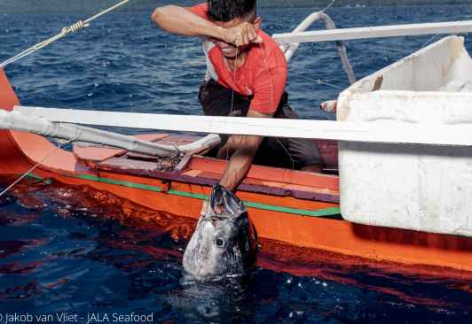 All the tuna from this fishery is caught using traditional handline methods, where only a single line, with a hook at the end is used per fisher. Vessels employ a crew of between 15 and 20 fishers at a time, who locate schools of yellowfin tuna, primarily by using dolphin sightings, which follow tuna schools when hunting. The fishery use small, coral reef fish as bait in the water to attract the yellowfin tuna to the boat, once a school has been located. The fishers lower their lines into the water where the tuna are located and wait until a fish gets caught on the hook. The fishers then haul the tuna onboard the vessel where they are instantly killed, and initially processed on board before being stored on flake-ice and returned to shore for sale. Non-target species (also known as bycatch) are animals that the fishery doesn’t want to catch, such as dolphins, turtles or sharks. The use of a single hook and line per fisher means that there is very little bycatch, and because fishing takes place at the surface of the ocean, there is virtually no negative impact on different marine habitats. This fishery catches around 28,000 MT of tuna every year!