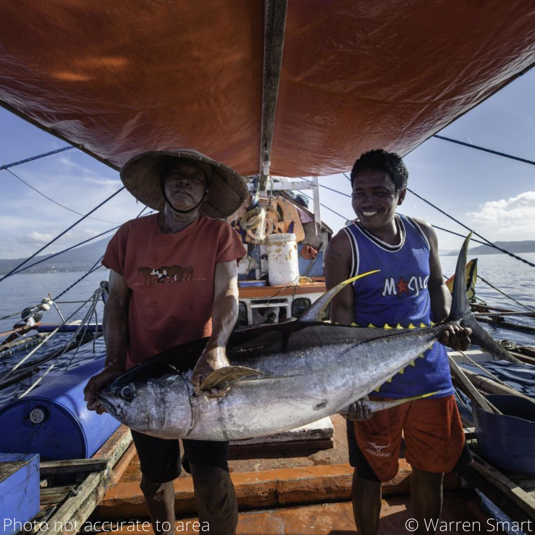 All the catch from this fishery is caught using the traditional handline technique, wherein each fisher uses a single line with a hook attached, to catch one fish at a time. Catch rates are monitored upon returning to shore, to ensure that vessels do not exceed their limits of tuna catch and are remaining sustainable. While vessel sizes vary, their crews can range from just one individual to a group of between one and five local fishers. A typical fishing trip will be anywhere from one-day to one-week, and can catch between 70 KG and 3,000 KG of yellowfin tuna per fishing trip - that’s between 500 and 20,000 cans of tuna! Using brightly coloured lures in a technique called “jigging”, small, live fish and squid are caught at the beginning of the fishing trips to be used as bait for the tuna. The fishery is very selective, which means it catches only yellowfin tuna (90% of the catch). Non-target species (also known as bycatch) are animals that the fishery doesn’t want to catch, such as dolphins, turtles or sharks. The use of a single hook and line per fisher means that there is very little bycatch, and because fishing takes place at the surface of the ocean, there is virtually no negative impact on different marine habitats. Fishers use an ice slurry to store the tuna, to maintain freshness before returning to land. Upon return, the catch will be transported to a local factory to be processed into fresh or frozen tuna products such as tuna loins, steaks, saku block, poke cubes, and minced tuna.
